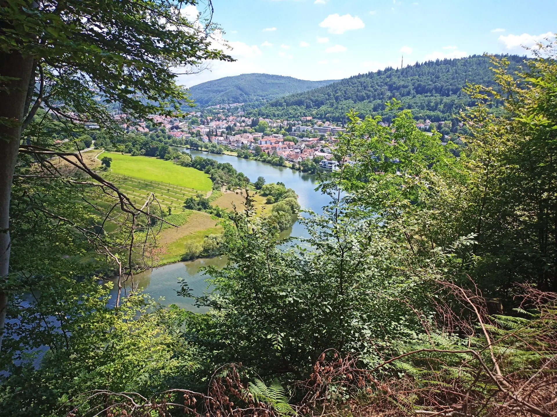 Dann starten wir die 11,5 km lange Wanderung. Zuerst geht es an den früheren Eisweihern vorbei durch den Wald und meistens bergab zum Rastplatz Hohler Kästenbaum, den wir nach einer guten Stunde erreichen. Dort halten wir unsere Mittagsrast und verpflegen uns aus dem Rucksack. Frisch gestärkt führt uns der Weg im Anschluss weiter durch den Wald, doch nun geht es mitunter auf schmalem Pfad recht steil bergab. Am Gämsberg-Pavillon bietet sich uns ein herrlicher Blick auf die Neckarschleife und Neckargemünd.